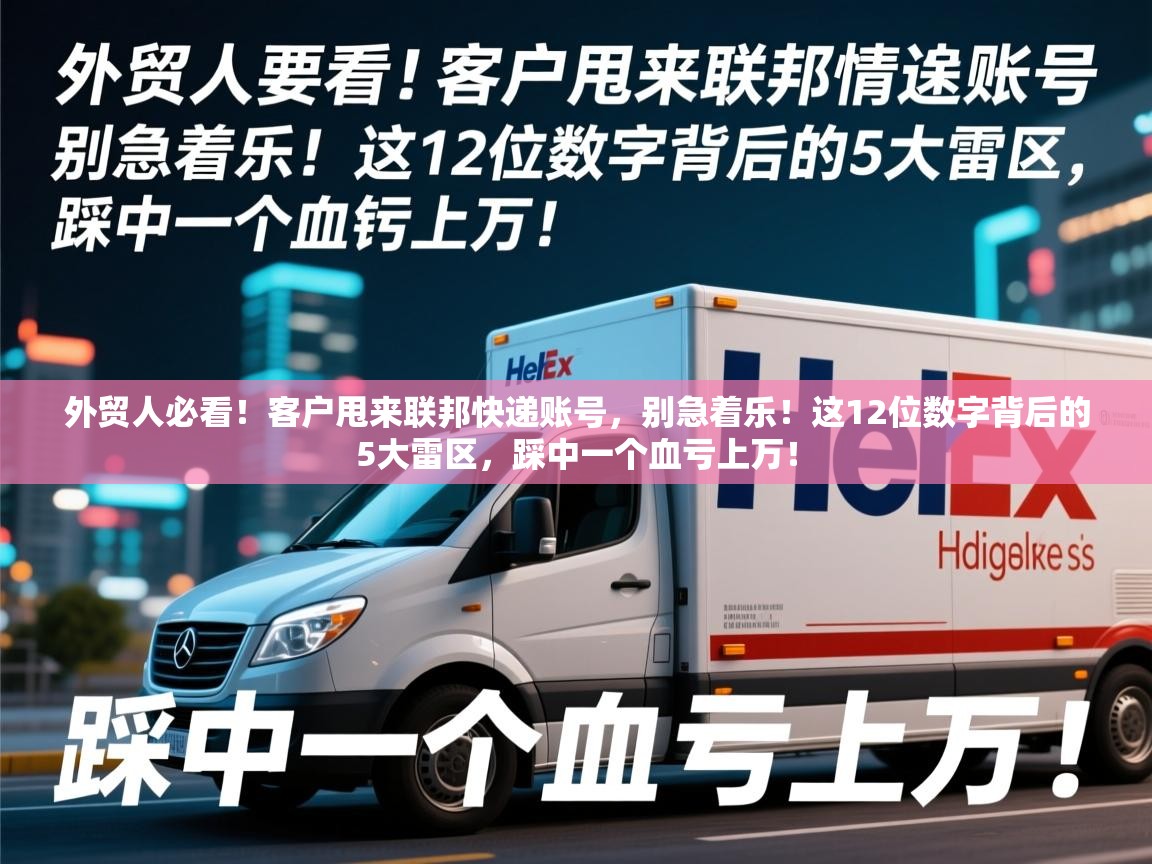 ,**,外贸人请注意!当客户主动提供联邦快递(FedEx)账号(那串12位数字)时,切勿盲目高兴,这背后可能暗藏巨大风险,贸然使用客户账号发货,极有可能踩中五大雷区:**运费到付争议**(客户拒付)、**高额附加费陷阱**(偏远地区、超重超尺寸等)、**关税税金纠纷**(收件人拒付)、**账号无效或欺诈风险**(导致货物被扣或运费追偿)、**影响自身信誉**(与FedEx关系受损),任何一个雷区被触发,都可能导致运费、税金甚至货物损失,造成上万元的经济损失,务必核实账号有效性、明确费用承担方、了解潜在附加费,并优先使用自己可控的支付方式,规避风险。,**核心要点提炼:**,1. **警示:** 客户提供FedEx账号是潜在风险信号,非单纯便利。,2. **五大风险:** 运费争议、高额附加费、关税纠纷、账号无效/欺诈、信誉损害。,3. **后果严重:** 任一风险均可导致重大经济损失(上万)。,4. **行动建议:** 核实账号、明确费用责任、了解附加费、优先自付。